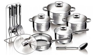 Bohatě vybavená sada nerezového nádobí od značky Blaumann.
