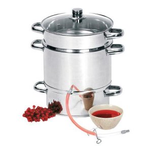 "rozměry: průměr 25 cm, výška celé soupravy 39 cm objem: 8 l složení soupravy: nádoba na vodu, nádoba na šťávy s vyprazdňovací trubicí, nádoba na ovoce Vhodný pro indukční vaření.