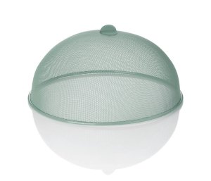 Skleněná poklice s plastovým úchytem a otvorem pro únik přebytečné páry.