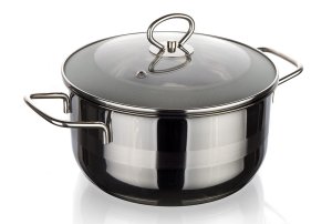 -Indukční nádobí Bergner-materiál: nerezová ocel 18/10, tloušťka 0,6 mm-stříbrná barva-celonerezové držadla-rozměry: průměr 24 x 18,5 cm, objem 7,7 L-sendvičové dno-skleněná poklice