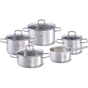 10dílná sada nerezového nádobí APETIT obsahuje: rendlík s pokličkou 13,5 x 7 cm, hrnec s pokličkou 15 x 8 cm, hrnec s pokličkou 17 x 9,5 cm, hrnec s pokličkou 21 x 11,5 cm, pánev s pokličkou 21 x 6 …