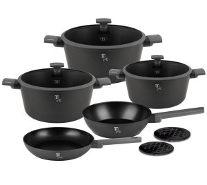 Tato sada nádobí je vyrobena z kovaného hliníku s černým mramorovým nepřilnavým povrchem, který zajišťuje vysokou kvalitu a odolnost.