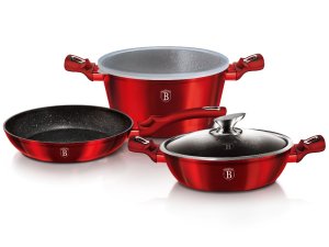 Sada pánví a grilovací desky s mramorovým povrchem 3 ks Metallic Line Burgundy Edition.Tato sada pánví a grilovací desky je vyrobena z kovaného hliníku, který zajišťuje vysokou kvalitu a odolnost.