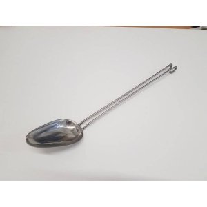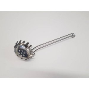 Naběračka děrovaná neboli pěnovačka z lesklé nerez oceli, délka 34 cm, s otvorem pro zavěšení, slouží k vytahování knedlíků při vaření.