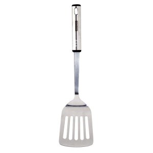 Kvalitní celonerezová děrovaná obracečka s háčkem na zavěšení, délka 36.5 cm, šířka 7 cm, vhodná do myčky nádobí.