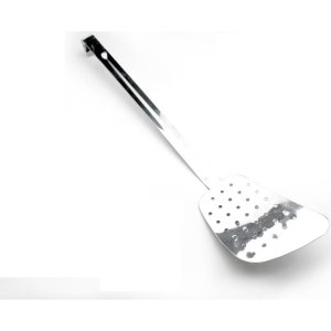 Kvalitní celonerezová děrovaná obracečka s háčkem na zavěšení, délka 36.5 cm, šířka 7 cm, vhodná do myčky nádobí.