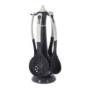 Sada kuchyňského náčiní, 5ks se stojanem z polypropylenu a protiskluzovou základnou z tpe. špachtle, naběračka, naběračka na polévku, servírovací lžíce a lžíce na špagety. bílá pp rukojeť s šedou nylonovou-6 …