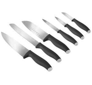 - Materiál: nerezová ocel s tmavší šedou nepřilnavou vrstvou- Nůž na chléb 20 cm- Kuchařský nůž 20 cm- Krájecí nůž 20 cm- Užitkový nůž 12,5 cm- Nůž na okrajování 9 cm- Bambusové prkénko na krájení- Barva: …