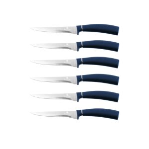 - Materiál: nerezová ocel- 6 ks steakových nožů 11,5 cm- barva: modrá aquamarine- Ergonomicky navržená odolná, nová rukojeť z měkčeného plastu- Titanové čepele- Laserem ostřené čepele- Stylové