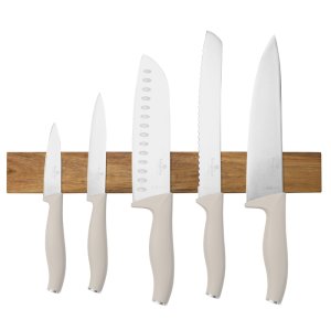 Sada 6 ks nožů s magnetickým závěsem z akáciového dřeva, Taupe Collection• Materiál: nerezová ocel 3cr13• Kuchařský nůž 20 cm• Nůž na chleba 20 cm• Nůž Santoku 17,5 cm• Pracovní nůž 12,5 cm• Nůž na krájení …