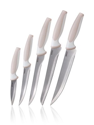 5 dílná sada TRINITY obsahuje praktický nůž 18,5 a 23,5 cm, porcovací nůž 32 cm, vykošťovací nůž 30 cm a nůž na chléb 32 cm.
