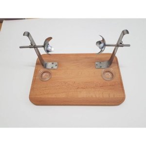 Držák na koleno nerez na dřevěné desce.