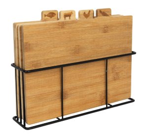 Sada bambusových prkének s kovovým stojanemPraktická sada bambusových prkének je přehledně uskladněná v černém kovovém stojanu.