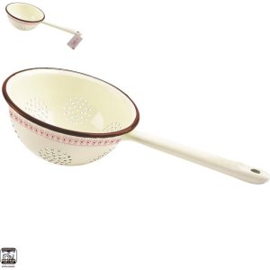 Bílý smaltový cedník se srdíčkovým dekorem o průměru 18 cm.