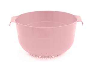 Jemný plastový cedník s vysokým lemem je šikovný pomocník v domácnosti.
