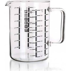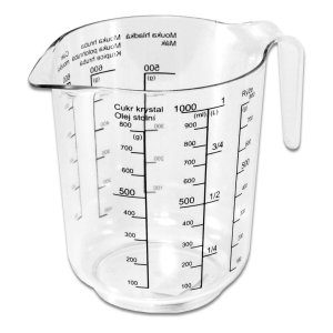 Odměrka s uchem a potiskem, který vám pomůže naměřit správné množství tekutin v ml, cukru, mouky .