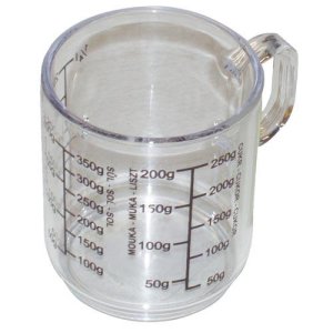 Plastový hrnek s odměrkou. Měření mouky, soli, cukru a vody.