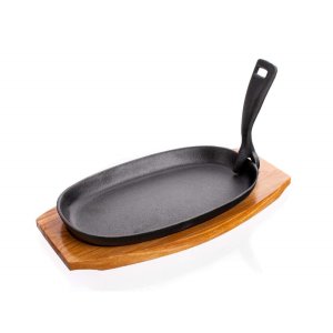 Litinová pánev 23 x 14 cm na dřevěném prkénku, odnímatelné litinové držadlo na vyndávání pánve z trouby.