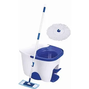 Úklidový komplet sestávající z kulatého kbelíku (objem 10 ltr) se ždímačem a bavlněným mopem s tyčí 120 cm.