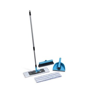 Úklidový set obsahuje: plochý mop, 2 náhrady z mikrovlákna, hlavu smetáku, teleskopickou tyč a smetáčkovou soupravu 3 barevné varianty: zelená, modrá a fialová (barvu nelze zvolit)