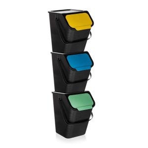 3dílná sada odpadkových košů na tříděný odpad BINI, určená na třídění skla, plastu a papíru.