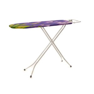 Žehlicí prkno s nastavitelnou výškou od 73 do 95 cm, kovová konstrukce s nástřikem proti korozi, protiskluzové koncovky, odkládací plocha na žehličku, potah s pěnovým polstrováním.