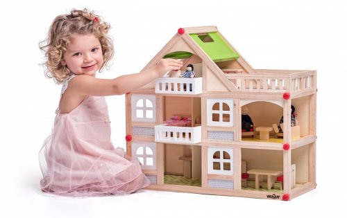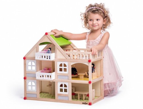 Designový domeček s plastovými balkony a rozlehlou terasou v horním patře nechá vyniknout klasické eleganci městských prvorepublikových vil. Díky otevřeným prostorům je snadno přístupný ve všech místnostech. Je vyroben v kombinaci materiálů: masivní dřevo a překližka. Vybavení domečku je velmi bohaté. Všechny místnosti jsou vybaveny nábytkem z masivního dřeva. Obsahuje celkem 19 ks příslušenství včetně 4 panenek. | Věk. 3+ | Rozměr: 55 x 26 x 51,5 cm