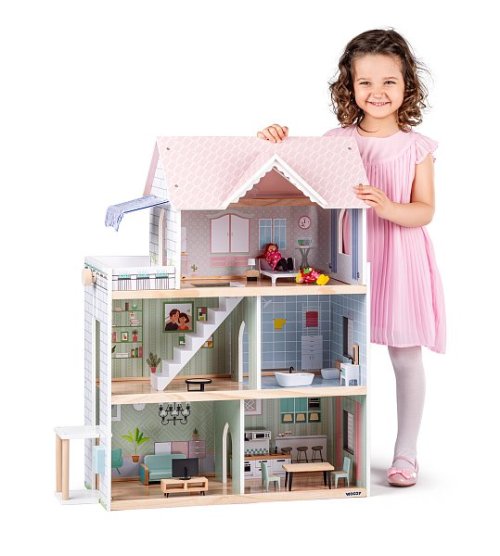 Kvalitní třípatrový domeček pro panenky dodáváme včetně zobrazeného příslušenství (17ks). Nábytek je vyroben z kombinace materiálů dřevo/ plast. Z přízemí do prvního patra se mohou panenky svézt výtahem. U vchodu je umístěn domovní zvonek. Třetí patro je vybaveno nejen prostornou terasou a markýzou, ale i funkčním světlem.| Věk: 3+ | Rozměry: 63,5 x 31 x 80 cm | Baterie: 2x CR2032 nejsou součástí balení.