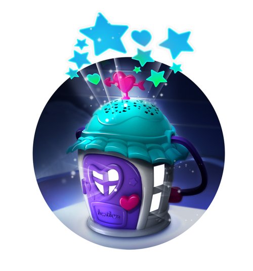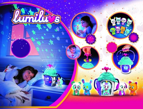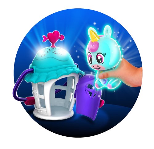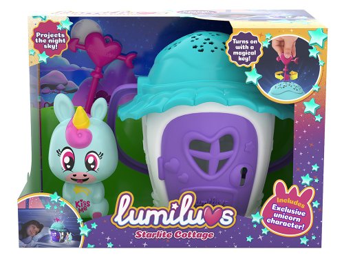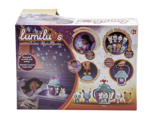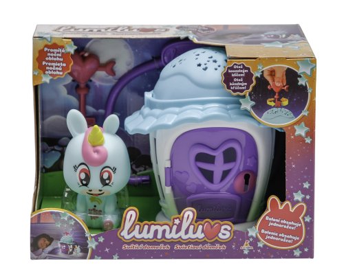 Set domečku a Jednorožce. Domeček pro Lumiluvs zahraje hudbu a rozsvítí hvězdy a srdíčka. Jednorožec svítí a brblá po fouknutí na bříško a pusince. Baterie: 3xAAA není součástí balení(domek), 3xLR44 je součástí balení (figurka). Pro děti od 3 let.