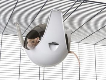 Plastový domeček pro malé hlodavce. Sputnik lze zavěsit nebo jen položit do klece.