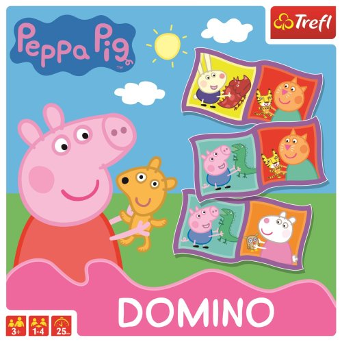 Domino s obrázky z animovaného seriálu Prasátko Peppa. Domino je populární hra s jednoduchými pravidly vhodná pro všechny věkové kategorie. Hra obsahuje: 28 ilustrovaných kartonových kartiček domina a pravidla. TREFL je kvalitní polská značka, která vyrábí společenské hry, karty i puzzle. Nabízí širokou škálu motivů zejména pro děti s aktuálně oblíbenými postavičkami z pohádek.