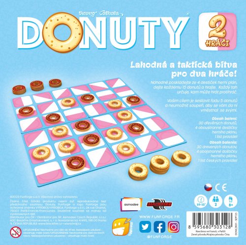 Jak hrát: První z vás umístí svůj donut na libovolné pole na herní ploše. Čára na poli, na které jste právě položili svůj donut, určuje, kam může zahrát svůj donut protihráč. Váš protihráč pak umístí jeden svůj donut na libovolné volné pole ve směrech určených touto čarou. Po umístění protihráčova donutu hrajete opět vy, a i vy musíte svůj další donut položit v linii určené čarou na právě obsazeném poli. Takto se střídáte.