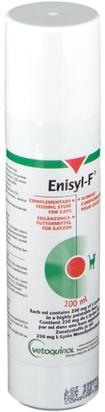 Enisyl-F je doplňkové krmivo s obsahem L-lysinu. Až 97% koček je sérologicky pozitivních na kočičí herpesvirus (FHV-1), který je příčinou nejběžnější infekce dýchacích cest u koček – studie dokazují, že suplementace L-lysinem redukuje u koček jak klinické příznaky onemocnění, tak vylučování samotného viru. Složení: Aktivní složka: 250 mg L-Lysin hydrochlorid v ml Ostatní složky: purifikovaná voda, sorbitol, rybí olej, xanthanová guma, sojový olej, tuňáková příchuť, sojový lecitin, silikagel, karamelová barva, sorban draselný, kyselina citronová. Dávkování: Dospělé kočky: 1 až 2 ml dvakrát denně. Koťata: 1 ml dvakrát denně nebo podle doporučení veterinárního lékaře.