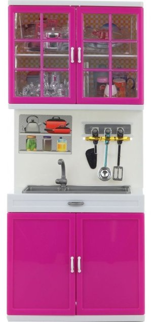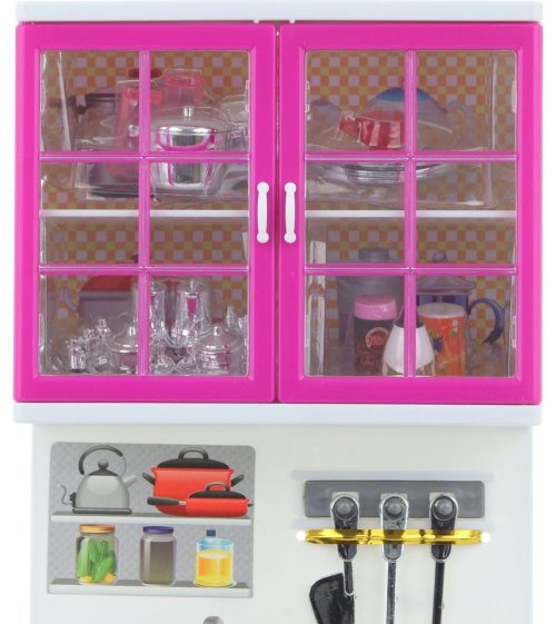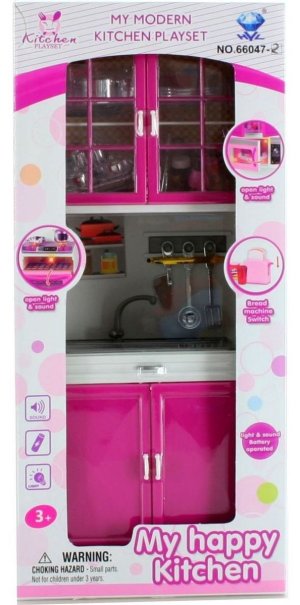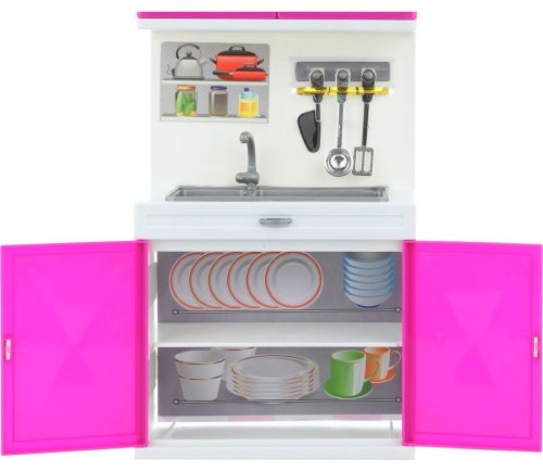 Kuchyňská linka s dřezem o rozměru 13 x 31 x 7 cm. Linka má otevírací dvířka a součástí je plastové nádobí a náčiní.
