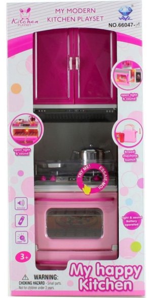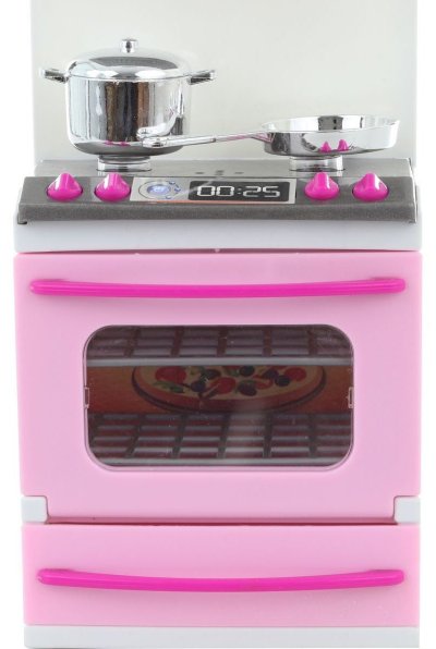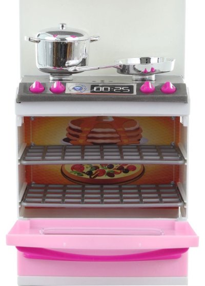 Plastový nábytek pro panenky. Kuchyňská linka s troubou o rozměru 10 x 31 x 7 cm. Linka má otevírací dvířka a součástí je plastové nádobí. Trouba a plotýnky svítí a vydávájí zvuky. Napájení baterie 2x LR44 (jsou součástí balení).