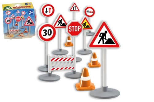 Sada dopravních značek. Sada obsahuje 17 dopravních značek se stabilizačním podstavcem. Rozměr 16 cm. Vhodné od 2 let.