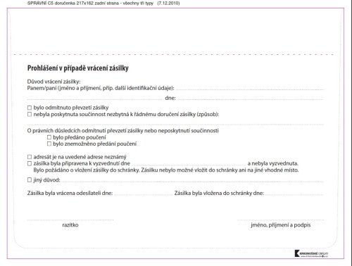 Na obálce je uveden text: Nevracet, vložit do schránky, uložit jen 10 dní