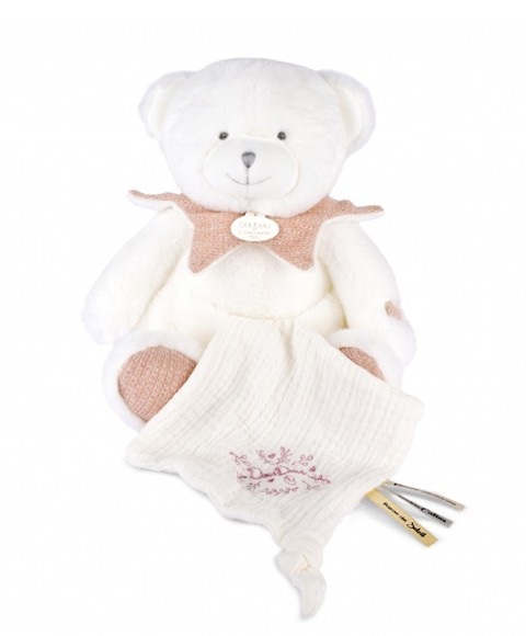Plyšový medvídek je ideálním dárkem pro děti již od narození. Součástí medvídka je měkoučká dečka, která je skvělá k mazlení a může pomoci miminku snadněji usnout. Dečku lze jednoduše schovat do bříška medvídka, což je praktické při cestování nebo ukládání. Je ozdobená jemnou výšivkou značky Doudou a saténovými stuhami s láskyplnými vzkazy ve francouzštině, které dodávají každému mazlení ještě něžnější pocit. Medvídek má stylové růžové srdíčko na tlapce, roztomilý růžový límeček pod krkem a hebké růžové tlapky, které mu dodávají něžný a přátelský vzhled. Díky jemným, trendovým barvám a kvalitním, hebkým materiálům je ideální pro malé děti, kterým přináší pocit bezpečí a pohodlí. Perfektní tip na dárek, který potěší a zároveň stimuluje smysly Vašeho miminka. Údržba: Perte v lázni na 30°. Přirozené nebo nízkoteplotní sušení. Hlavní vlastnosti: měkký plyš, prémiový materiálvhodné od narozenív souladu s evropskými normami CEideální jako dárekpraktická dárková krabička