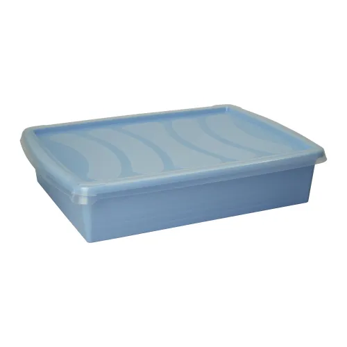 Pevná nízká plastová dóza s částečně průhledným víkem. Rozměry 36 x 27 x 7 cm. Vhodná pro styk s potravinami, do myčky nádobí, mikrovlnné trouby a mrazničky. Vyrobeno v EU. Barva misky dle skladové dostupnosti. EAN 5997444125183