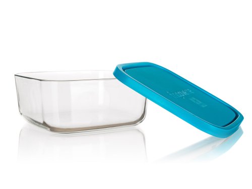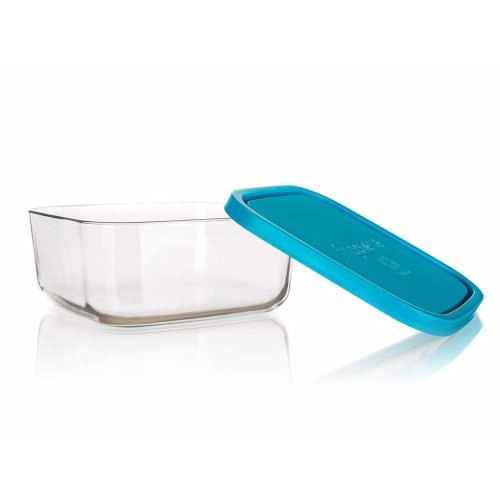 objem: 1 l rozměry: 15 x 15 x 5 cm materiál: sklo, polypropylenové víčko barva víčka: modrá