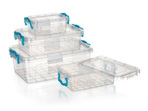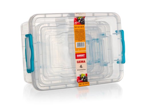 Sada čtyř plastových multifunkčních boxů GEMA o s tyrkysovými madly je vhodná nejen pro ukládání předmětů, ale i jejich přepravu.