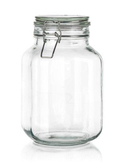 Skleněná hermetická dóza EREA 2 l se skleněným víčkem a kovovým zavíracím patentem.