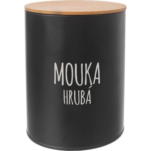 Designová plechová dóza s matným černým povrchem pro uskladnění hrubé pšeničné mouky, vhodné např .