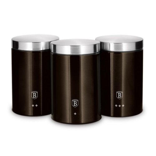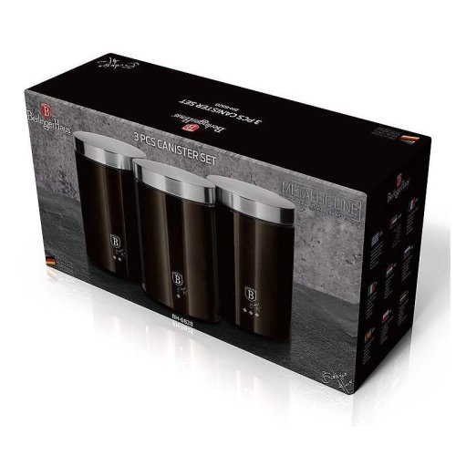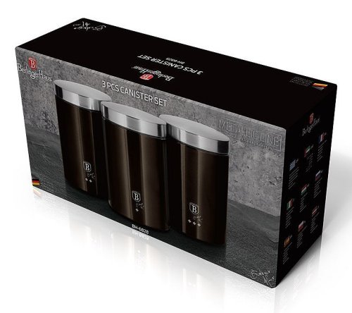 Sada, obsahující 3 kusy designových dóz na potraviny v černém provedení - tělo i víko jsou vyrobené z nerezové oceli - určené především pro skladování suchých potravin - dózy jsou ideální na kávu, čaj, cukr, mouku, tětoviny, bylinky, skořápkové plody, atd.. - stylové řešení jak uchránit potraviny před vlhkostí, nečistotami nebo před hmyzem - nerezová ocel je netoxická a neabsorbuje pachy potravin - jednoduchá údržba - barva: černá metalická - Sada, obsahující obsahuje 3 kusy - rozměry dóz: 11 x 18 cm - značka: berlingerhaus