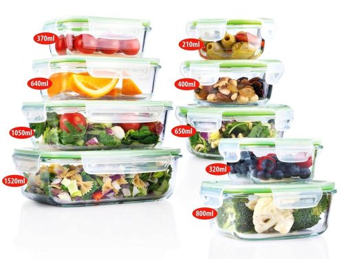 S touto kuchyňskou sadou alpina získáte celkem 9 různých nádob na potraviny s víkem. K dispozici jsou menší velikosti 210, 320, 370, 400 a 640 mililitrů, které jsou ideální pro ovoce a svačiny. Ale máte k dispozici i větší velikosti 650, 800, 1050 a 1520 mililitrů, které můžete použít pro skladování kompletních jídel.