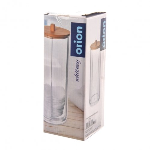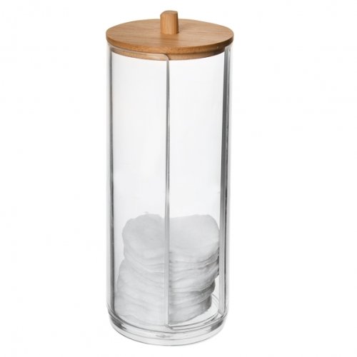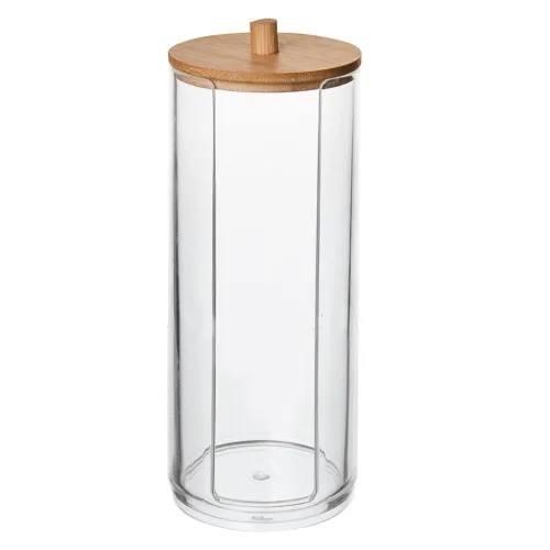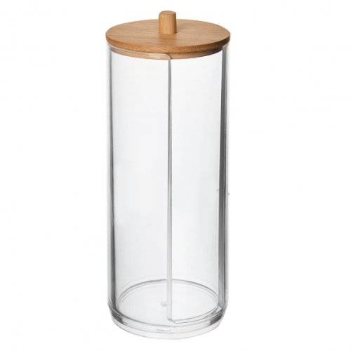 Dóza na vatové tampóny s víčkem. Praktický pomocník do koupelny. Snadno jsou vám k dispozici, koupelna zůstává uklizená. Materiál plast, bambusové dřevo. Průměr 7 cm, výška 17.5 cm. EAN 8592381173609