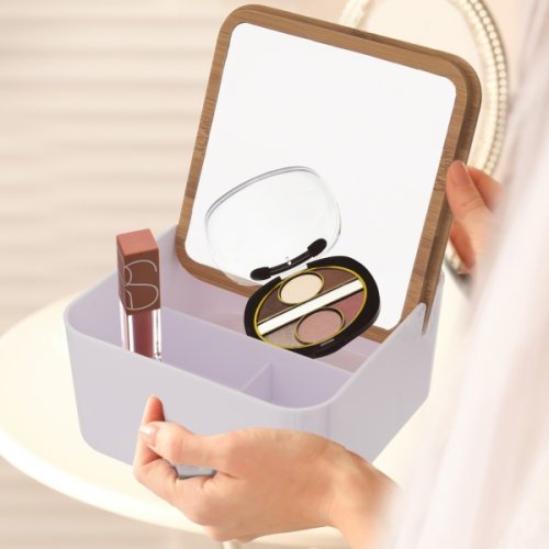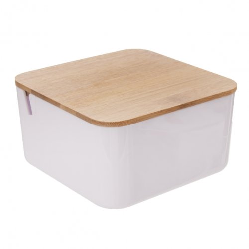 Dóza s víčkem na uložení dekorativní kosmetiky. Na vnitřní straně víčka je zrcátko, které poskytuje možnost nalíčení obličeje kdekoli, nejen v koupelně. Využijete ji doma i na cestách. Materiál plast, bambusové dřevo, sklo. Rozměry 14 x 14 x 7 cm. EAN 8592381170431