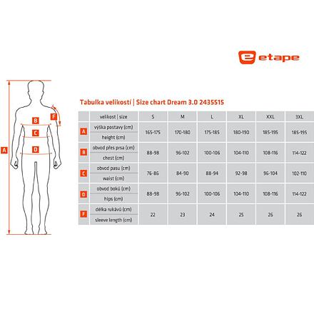 Pánský cyklistický dres Etape Dream 3.0 ocení každý cyklista, ať už na kole jezdí pravidelně či rekreačně. Dres s krátkým rukávem je vyrobený z elastického materiálu MicroCool – funkční elastický materiál z polyesterových mikro vláken, který velice rychle schne, odvádí pot a vlhkost od pokožky. Dres dále nabízí dlouhý přední zip, panely z funkční elastické síťoviny AirMeshTM pro větší komfort a 3 zadní kapsy pro uložení drobností. Díky použitým reflexním prvkům budete na cestě vždy dobře viděn. Velikostní tabulka v obrázcích. Uvedené hodnoty jsou pouze orientační a vhodná velikost se může lišit dle konkrétního typu postavy.