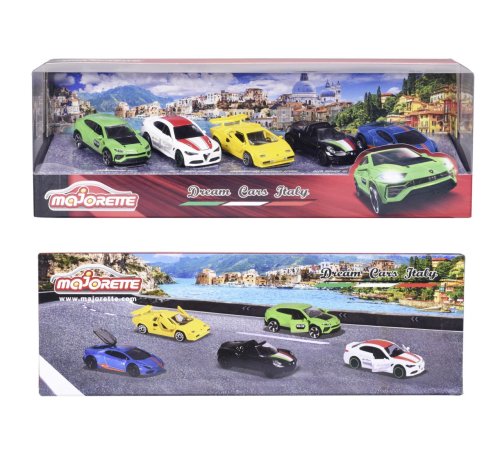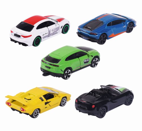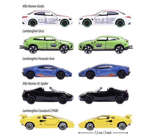 Dárková sada 5 různých italských autíček. Kovová autíčka na volnoběh s otočnými koly, zavěšením a kloubovými částmi. Obsahuje Alfu Romeo 4C Spider, Lamborghini Countach LP 400, Lamborghini Huracán Avio, Lamborghini Urus, Alfu Romeo Giulia. Délka 7,5 cm.