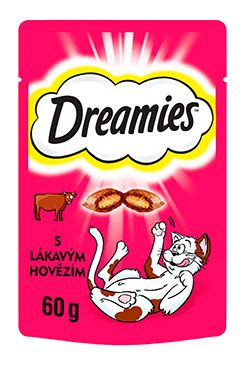 Dreamies křupavé polštářky plněné jemným krémem s hovězí příchutí. Kočky šílí po neodolatelné chuti kočičích pamlsků DREAMIES. Lahodné a křupavé zvenku, měkké uvnitř – kočky jednoduše nedokáží odolat skvělé chuti DREAMIES. Tak jen do toho, zatřeste sáčkem a sledujte, jak se k vám vaše kočka rozběhne.